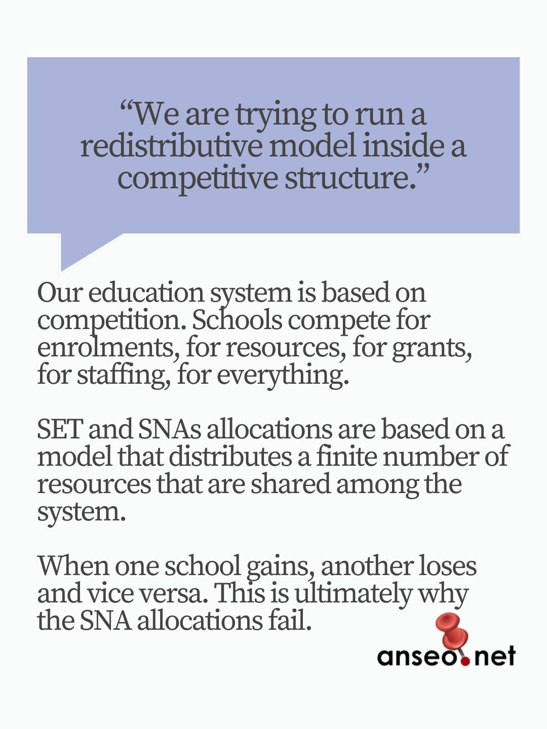 We have to admit it. Our education system is set up so schools compete against each other. – Drive through any town and you’ll see election-style posters urging you to enrol your child. Often you’ll see these posters outside the school’s catchment area. – Observe the SET Allocations that will