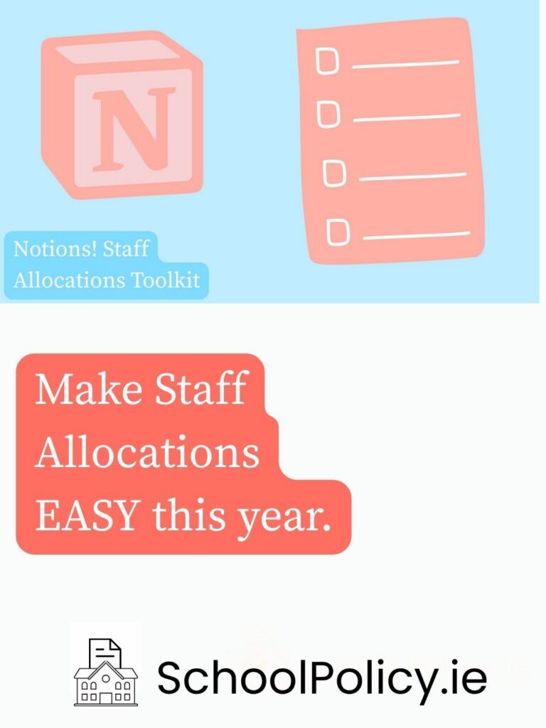 Next week you might start thinking about Staff Allocations. I created a toolkit for principals that helps you complete the entire process from designing the form to send out to staff to ensuring that everyone gets their fair go at each class. Free to registered schools at schoolpolicy.ie – https://schoolpolicy.ie/notions-staff-allocations-toolkit/