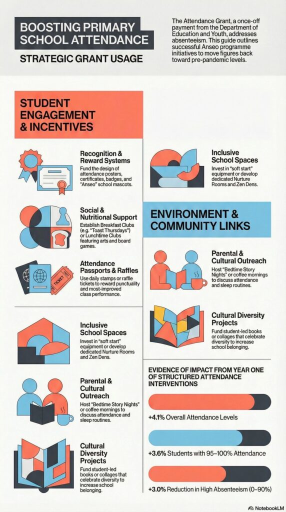 How schools can use their Anseo Attendance Grant from information sent out by Department on Tuesday. https://www.gov.ie/en/department-of-education/publications/attendance-campaign-support-grant/